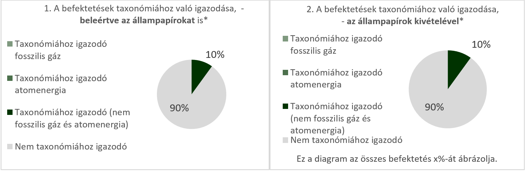 termék összes befektetéséhez viszonyítva mutatja be a taxonómiához való igazodást, beleértve az állampapírokat is, míg a második