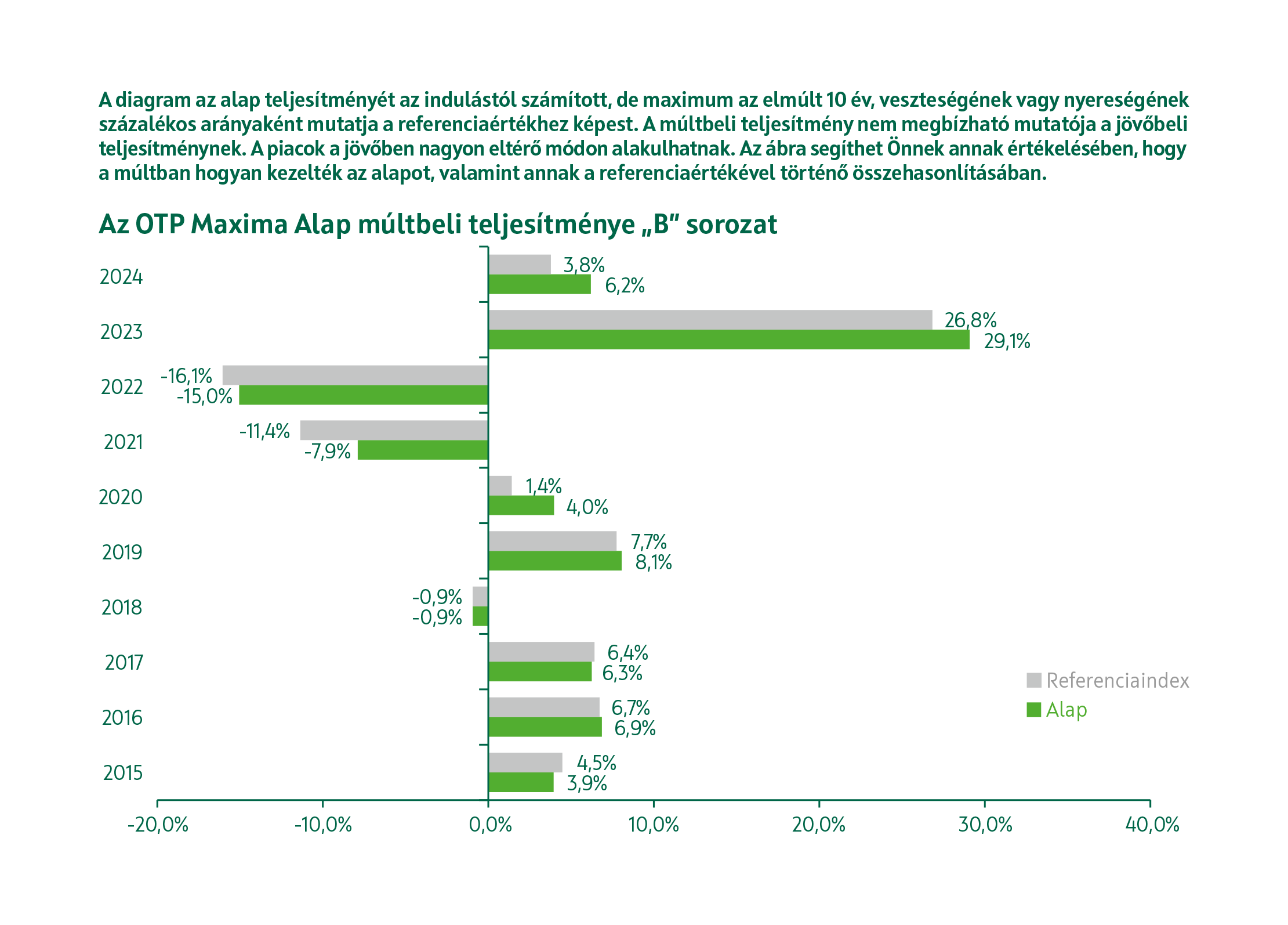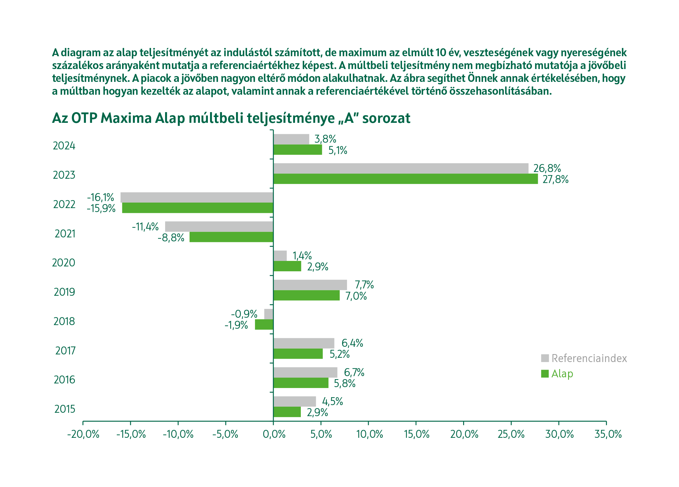 Referenciaindex (benchmark): az alap nem indexkövető, a referenciaindex összetételét az Alapkezelő a befektetési döntéshozatalhoz, illetve az alap teljesítményének méréséhez használja fel. A referenciaindextől való eltérés nincs korlátozva. Az alap összetétele és teljesítménye jelentősen, vagy akár teljes mértékben, rövid vagy hosszú távon, pozitív vagy negatív irányba eltérhet a referenciaindexétől.
