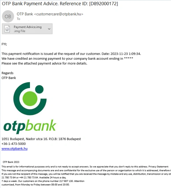 A megtévesztő, angol nyelvű e-mail egy állítólagos kifizetésről értesíti az ügyfelet. A csatolmány – Payment.Advice.img – kártékony, megnyitásával az érintett korlátlan hozzáférést biztosít számítógépéhez, ha eszköze Windows operációs rendszert használ.
