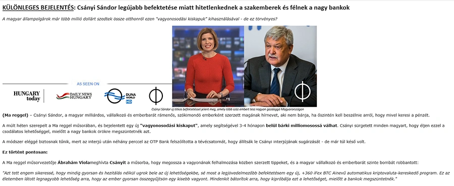 A bűnözők mások mellett most Dr. Csányi Sándor, az OTP Bank elnök-vezérigazgatójának nevét és fotóit használják fel arra, hogy gyanútlan és hiszékeny embereket tőrbe csaljanak, valószínűtlen hozammal kecsegtető, befeketésnek álcázott ígéretekkel megszerezzék az adataikat és a pénzüket.
