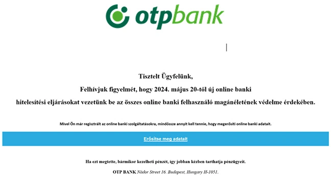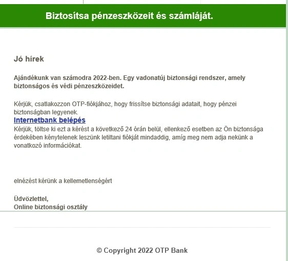 Egy újabb, hivatalosnak tűnő e-mail segítségével próbálnak banki adatokat megszerezni. A bűnözők az OTP Bank nevében, megtévesztő e-mail címről küldik levelüket: customercare@otpbank.hu