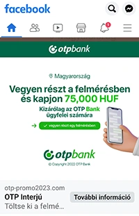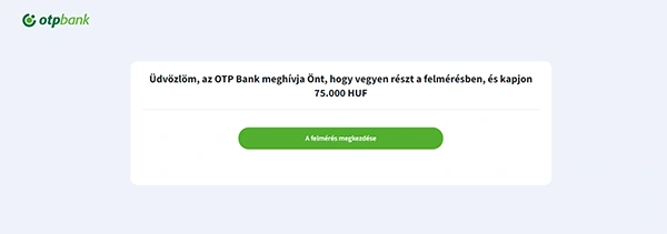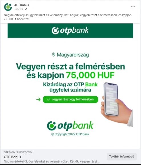 Az OTP Bank felhívja ügyfelei figyelmét arra, hogy nem hirdetett a közösségi médiában pénzjutalommal járó ügyfélfelmérést, illetve soha nem kér a hirdetésben szereplő adatokat felmérésekhez.