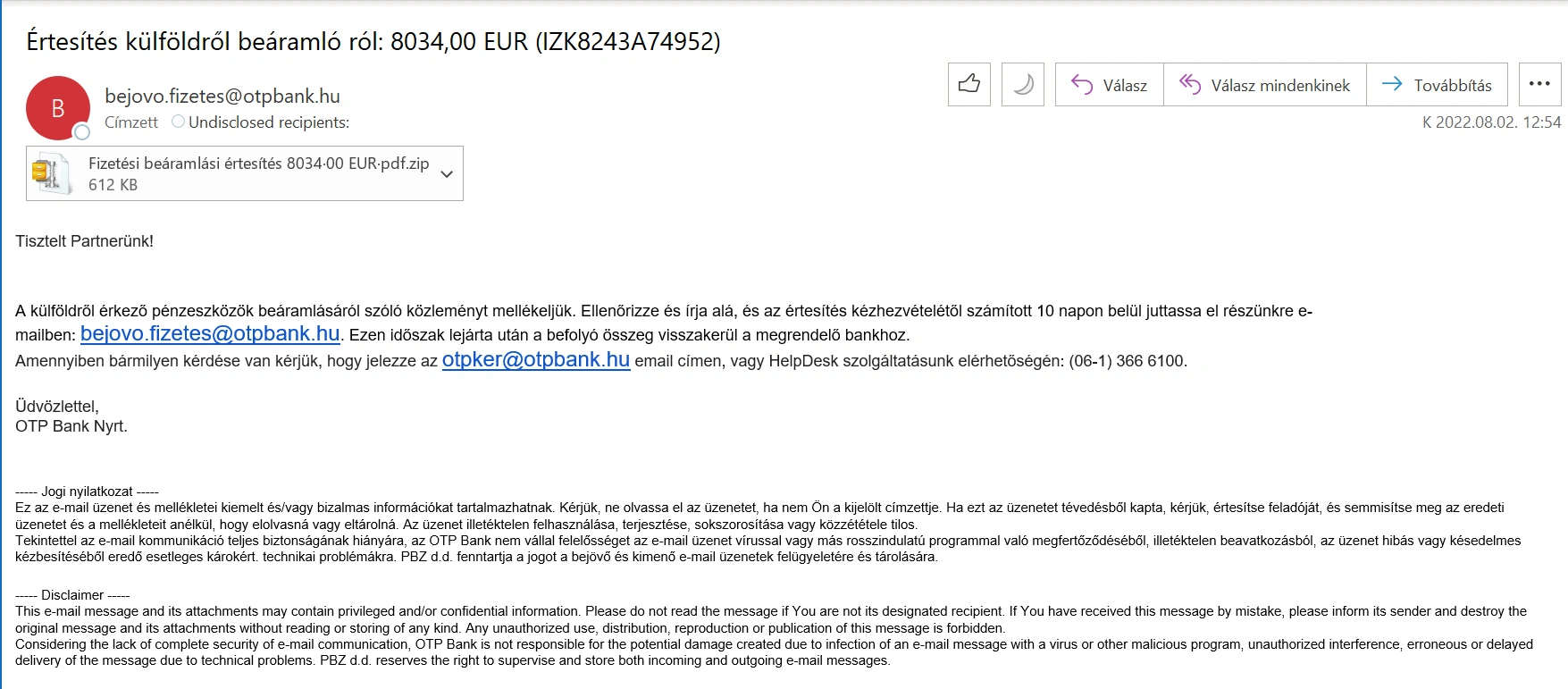 A levelek hamisított e-mail címről érkeznek, azt a látszatot keltve, mintha a levél a hitelintézettől érkezett volna. Minden esetben a bejovo.fizetes@otpbank.hu a feladó, az e-mail tárgya pedig minden esetben az "Értesítés külföldről beáramló ról: 8034,00 EUR (IZK8243A74952)"