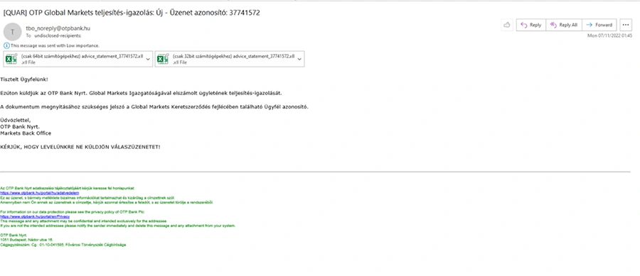 A csalók ezúttal az OTP Global Markets nevével visszaélve, hamisított címről küldenek megtévesztő és veszélyes adathalász e-maileket, kártékony csatolmánnyal, melyekben az e-mail tárgya és üzenete az OTP Global Markets elszámolt ügyletek teljesítésigazolásával kapcsolatos.
