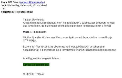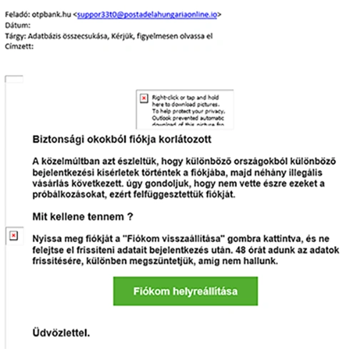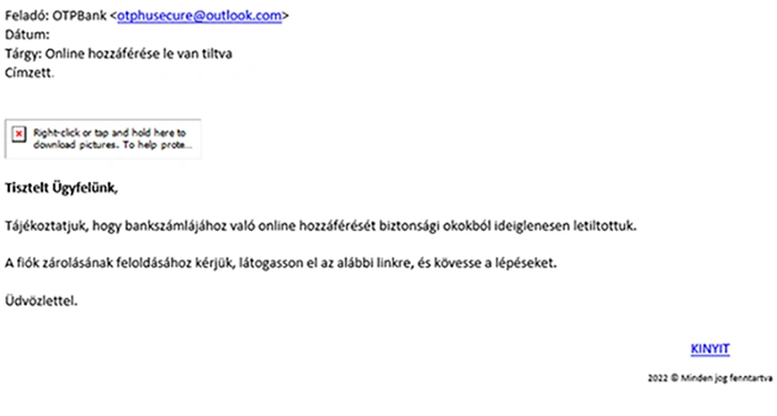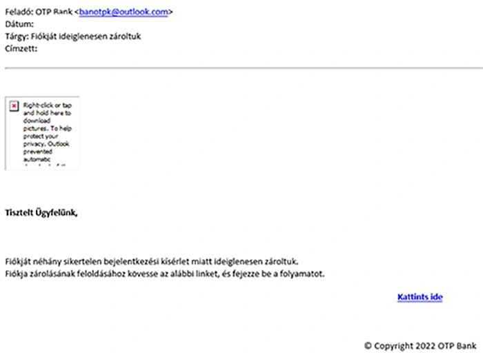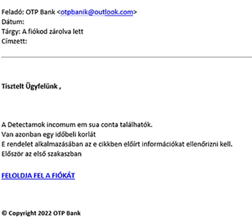 A csalók ezúttal is az OTP Bank nevével visszaélve küldenek megtévesztő és veszélyes adathalász e-maileket, és benne kártékony csatolmányt, melyekben az email tárgya és üzenete szinte minden esetben a fiók zárolásával kapcsolatos.