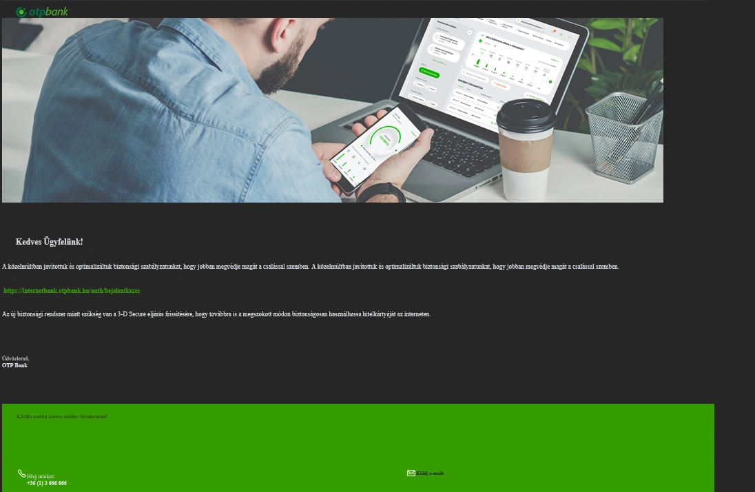 Az adathalászok egy újabb formátumú levéllel próbálják félrevezetni a bankszámla tulajdonosokat. Úgy tüntetik fel, mintha egy hivatalos, az OTP Bank által írt e-mail lenne, pedig súlyosan visszaélnek az OTP Bank nevével.