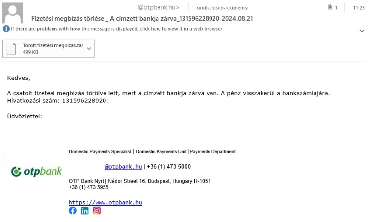 Az e-mail csatolmánya tartalmaz egy tömörített mappát (Törölt fizetési megbízás.tar), amelyben kártékony fájl található.