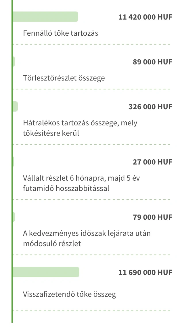 - A hátralék mértékétől függően lehetőség van a hátralékos tartozás tőkésítésére (kivéve kamattámogatott lakáshiteleknél, a kamattámogatási időszak alatt).