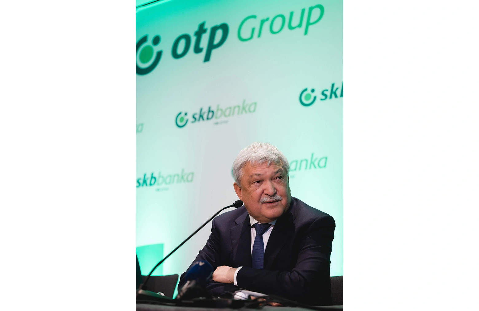 sajtótájékoztatóján. Az OTP Bank az SKB Bank felvásárlásával annak 99,73