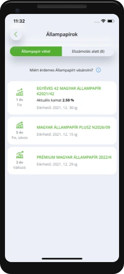 Az elérhető állampapírokat a Megtakarítások menüpontban lévő listából választhatod ki, itt megtekintheted a kiválasztott állampapír részleteit is, a befektetni kívánt összeg megadása után beküldheted a vételi megbízást.