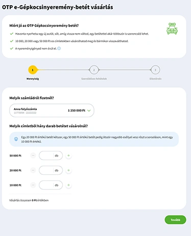 1. Válaszd az OTP InternetBank Megtakarítási lehetőségek menüpontjában az OTP Gépkocsinyeremény-betétek lehetőségnél a vásárlás gombot.