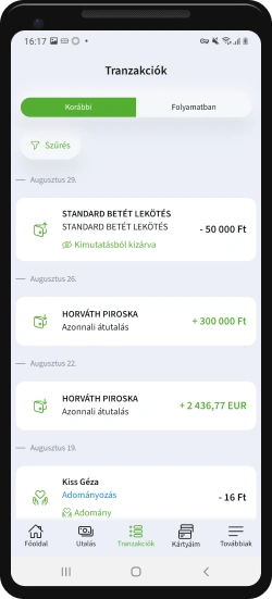 A Tranzakciók/Számlatörténet menüpontban megtalálod az összes megvalósult és folyamatban lévő tranzakciódat, amelyeket többféle szűrőfeltétel alapján is lekérdezhetsz.