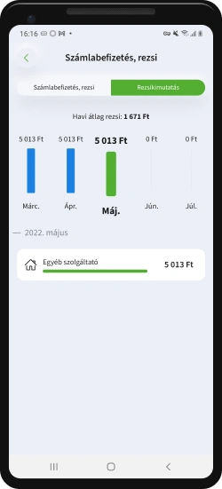 Ha a Rezsikimutatás fület választod, diagramon követheted nyomon, hogy havonta hogyan alakulnak a rezsikiadásaid. Az adott havi költségeket tételesen is meg tudod jeleníteni.