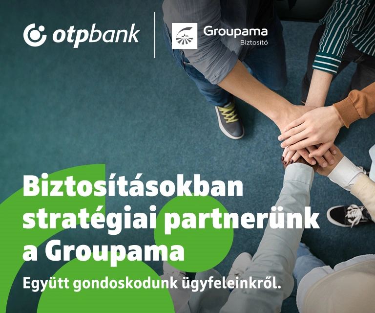 Hirdetésünk tájékoztató jellegű, nem tartalmazza a termékkel kapcsolatos valamennyi információt és nem minősül ajánlattételnek. A biztosítási terméket a Groupama Biztosító Zrt. (1146 Budapest, Erzsébet királyné útja 1/C.) nyújtja, amelyet az OTP Bank a Groupama Biztosítóval kötött szerződés alapján értékesít. A biztosító szolgáltatásait a vonatkozó biztosítási feltételek szerint nyújtja. A teljes körű tájékozódás érdekében kérjük, olvasd el a www.otpbank.hu/biztositas oldalon közzétett vonatkozó biztosítási feltételeket és termékismertetőket, amelyek tartalmazzák többek között a biztosító szolgáltatásának korlátozását, a kizárásokat és a mentesüléseket. A biztosító felett a szakmai felügyeletet a Magyar Nemzeti Bank (1013 Budapest, Krisztina körút 55.) látja el.